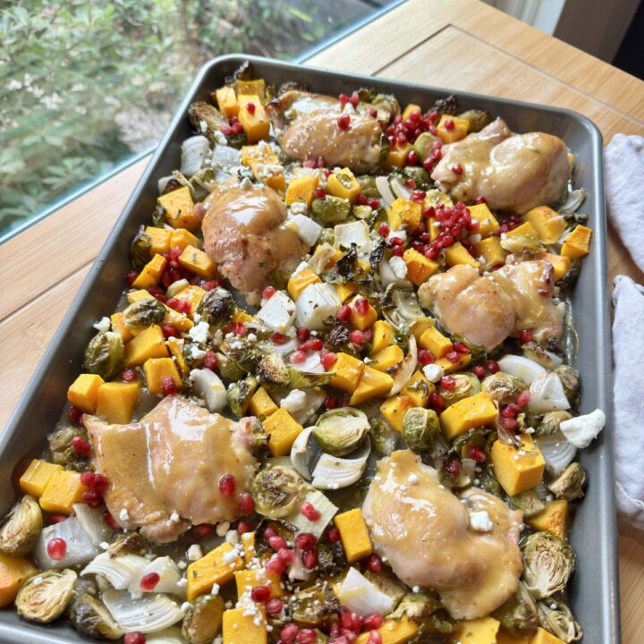 I love a good sheetpan meal for an easy dinner and there are so many ways to switch them up while still keeping them simple and satisfying too! It’s a quick way to pack in a bunch of veggies into a meal like I did in this one with the brussels sprouts, butternut squash and onion. I can’t get enough of the fall veggies and love including them into meals like this for a quick roast. The honey mustard flavor is one that I’ve always loved and it’s so delicious on chicken and veggies too. This meal would be perfect to make into a bowl with a grain like farro or rice or have it on it’s own!